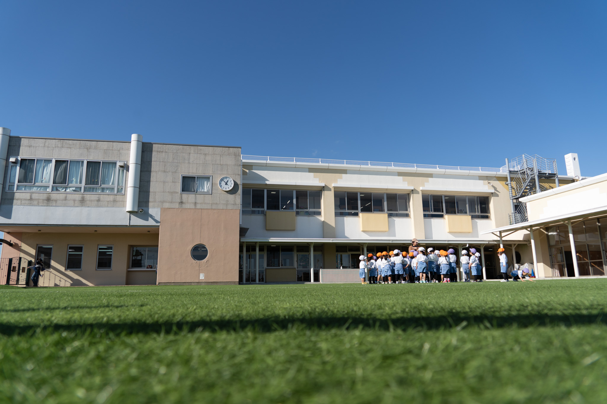 園庭が全面人工芝になっているため、砂埃や泥汚れを気にすることなく、こどもとより近い位置で一緒に遊ぶことができます。